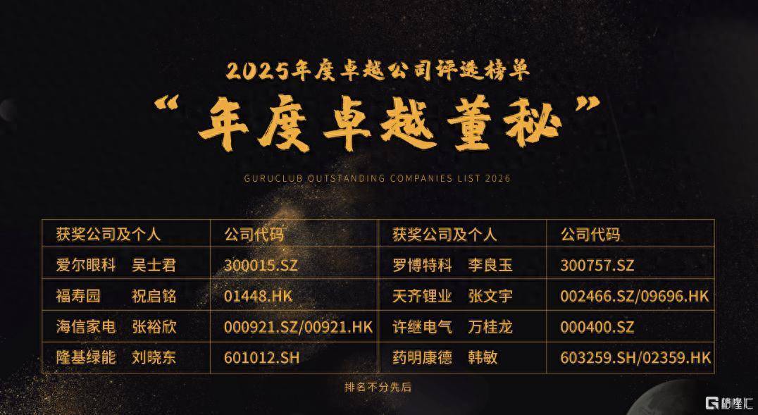 2025年12月22日,中国领先的全球投资研究平台格隆汇以线上形式举办“科技赋能·资本破局”主题分享会。作为活动的核心环节,格隆汇“金格奖”年度卓越公司评选榜单正式揭晓,其中“年度卓越董秘”奖项覆盖港股、A股、美股三大市场的中国上市公司,最终爱尔眼科吴士君、福寿园(01448.HK)祝启铭先生、海信家电张裕欣等8位董秘(按公司首字母顺序排列,排名不分先后)凭借突出的年度表现脱颖而出。