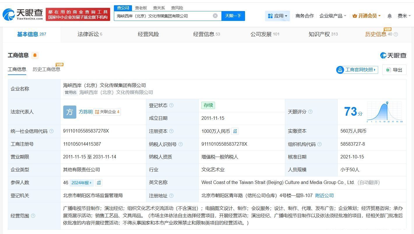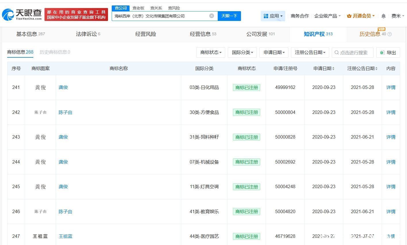 值得一提的是,李艺彤新签约公司海峡西岸(北京)文化传媒集团有限公司成立于2011年11月,法定代表人为方陈明,注册资本1000万人民币,经营范围包括广播电视节目制作、演出经纪、组织文化艺术交流活动等,由厦门锦松文化合伙企业(有限合伙)、珠海横琴蓝彧文化传媒有限公司、上海海俊星品牌管理合伙企业(有限合伙)等共同持股。知识产权信息显示,该公司已成功注册多枚“龚俊”“王祖蓝”等艺人姓名商标。