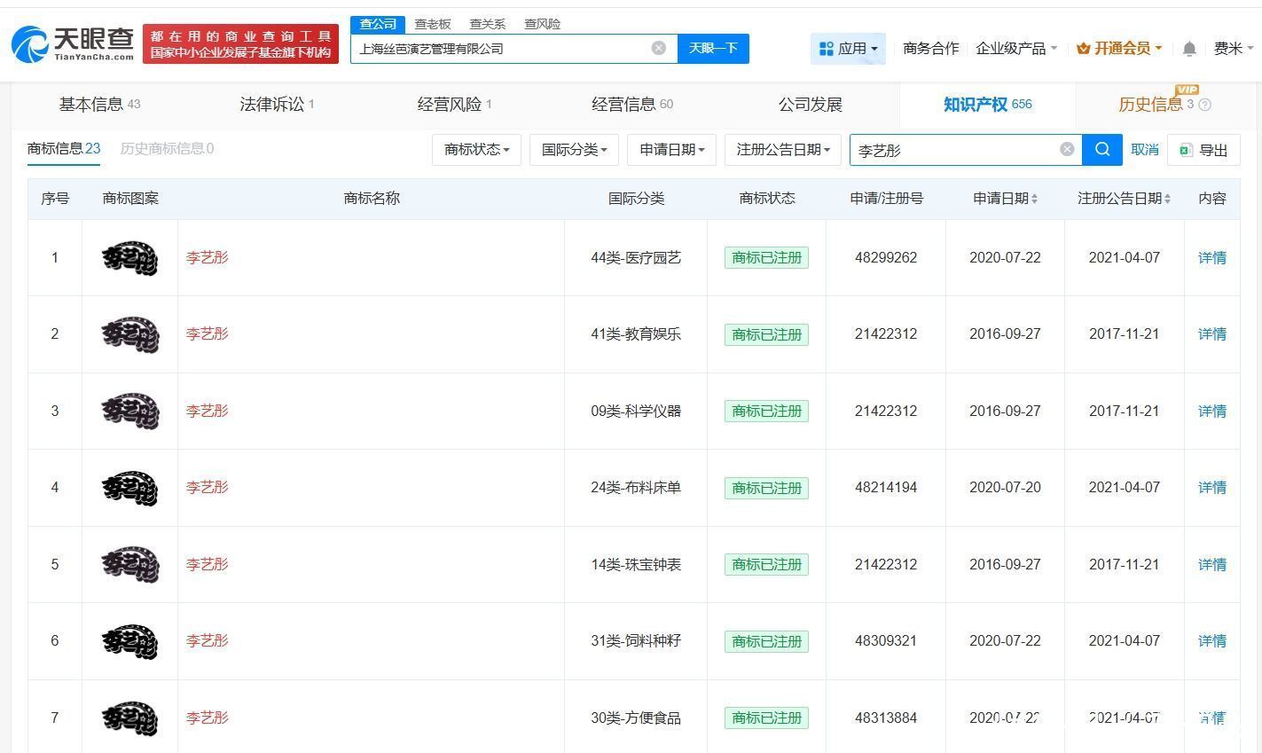 天眼查知识产权信息显示,上海丝芭演艺管理有限公司已注册多枚“李艺彤”商标,国际分类涉及医疗园艺、教育娱乐等,当前商标状态均为已注册。